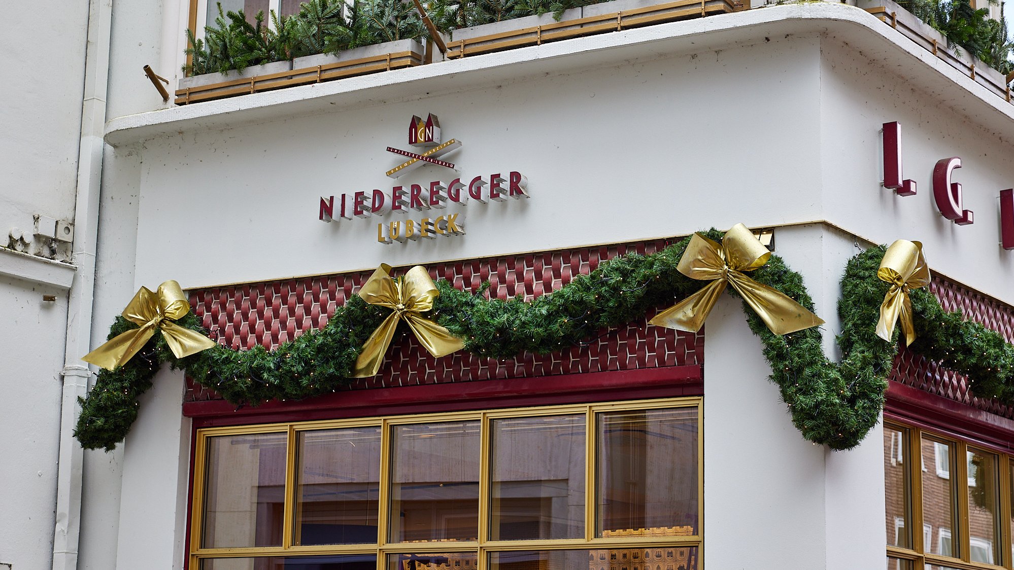 Nach paar Schritten stehen wir am historischem Marktplatz mit dem Rathaus und den Arkaden. Der dunkle Arkadenanbau an das weiße Rathaus wirkt etwas merkwürdig, stammt aber bereits aus dem 14. Jahrhundert. Am Marktplatz liegt auch das Café Niederegger - hier gibt es das Lübecker Marzipan in sämtlichen Varianten.