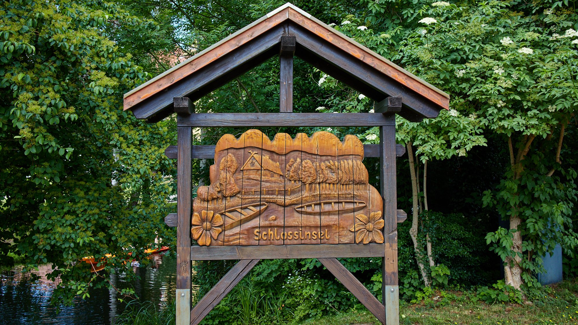 Der Rundweg führt einmal über die Schlossinsel, das Schloss liegt direkt gegenüber, und man erreicht über eine kleine Brücke wieder die Hauptstraße.